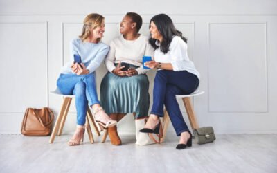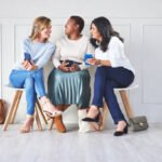 Conversation, candidates and women in waiting room with phone talking and sharing at recruitment agency. Human resources, hiring and diversity, group of people in lobby checking smartphone together.
