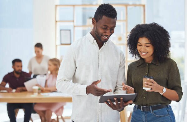 Productivity, teamwork and business people with tablet for collaboration, communication and online marketing agency planning. Office black people, digital technology and website information strategy