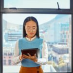 Glasses, tablet and Asian woman in city office reading email, social media or digital research for networking. Business, internet search and businesswoman from Japan, workplace window and cityscape.